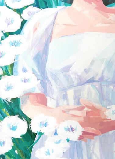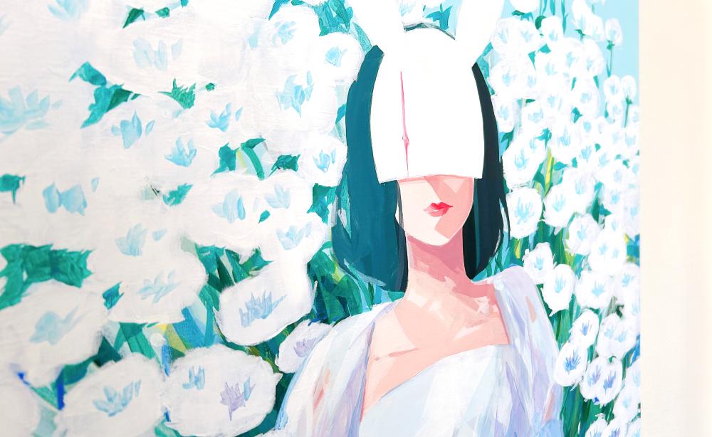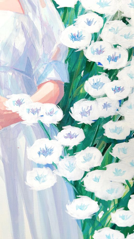 In this body of work, I depicted young women standing in Shibuya, with their surroundings gradually transforming into fields of flowers—not through video, but through a sequence of paintings (two size M60 pieces and six size M6 pieces). Each canvas captures the passage of time in still images, much like the key frames of an animation.