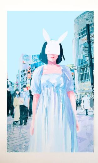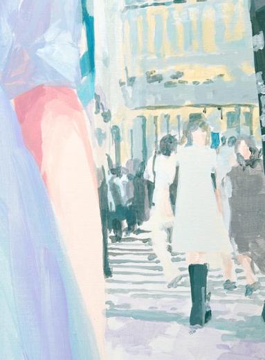 In this body of work, I depicted young women standing in Shibuya, with their surroundings gradually transforming into fields of flowers—not through video, but through a sequence of paintings (two size M60 pieces and six size M6 pieces). Each canvas captures the passage of time in still images, much like the key frames of an animation.