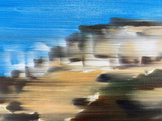 それによってできた絵の具の滲みや掠れは、モチーフそれぞれのイメージによって見え方が異なりますが、動きや時間の経過のように感じとることができると私は考えています。