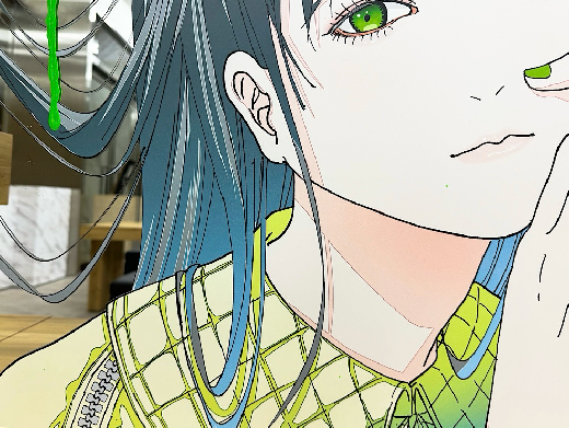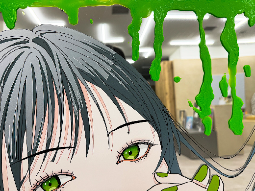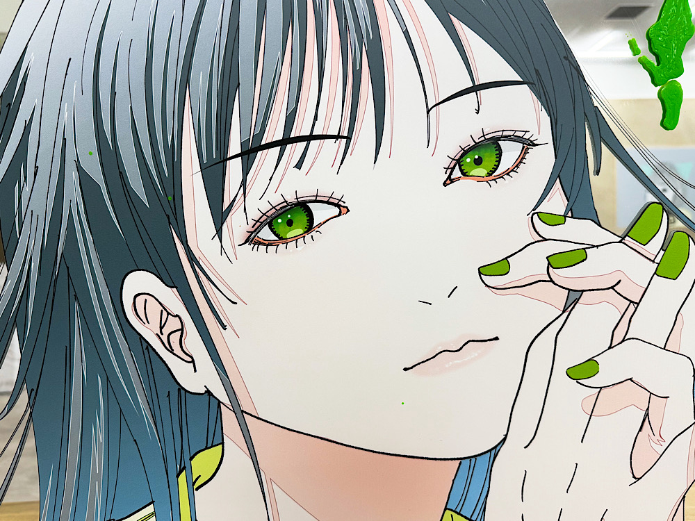 I chose a green-based color scheme because green backgrounds are used for CG-based works, and this color succinctly represents the border between reality and unreality.