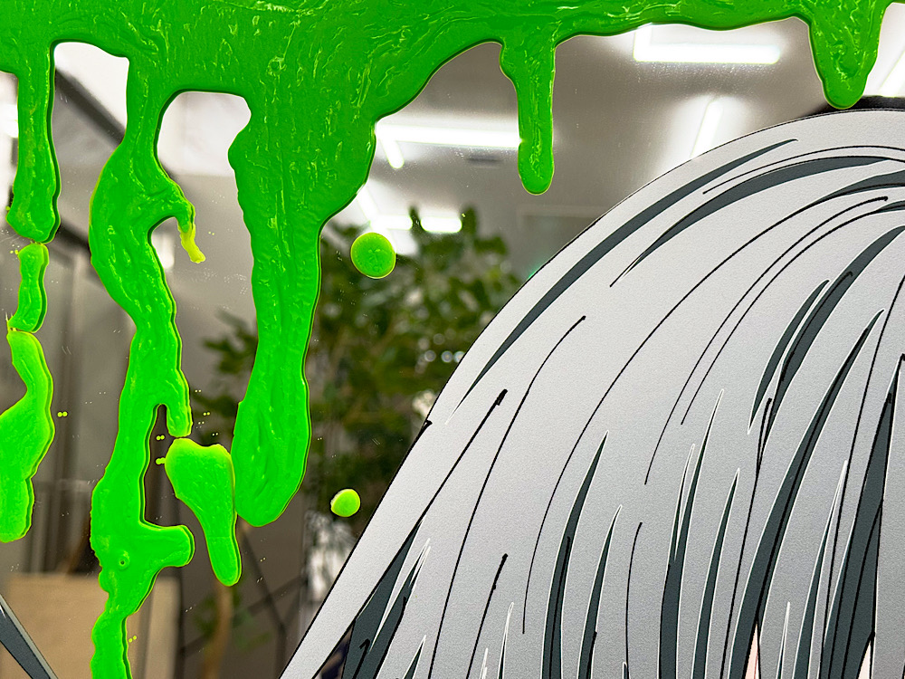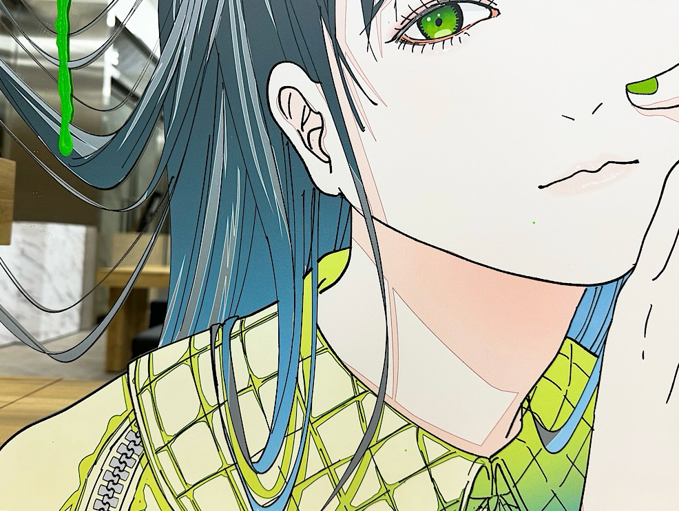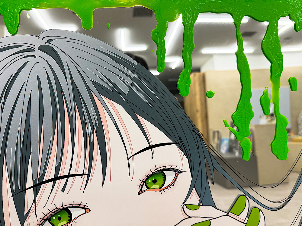 ミラー加工のアクリル板にUV印刷を施し、その上からアクリル絵の具で加筆をした作品になります。