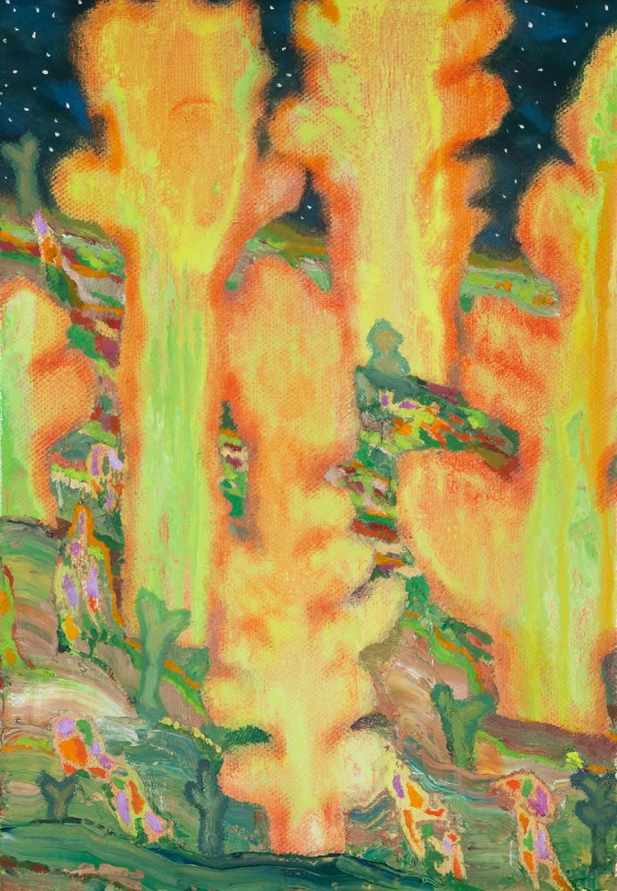 生物の幼生や幼体、植物の新芽や花などを描いている。成体になる前の柔らく曖昧なその段階は「これから」どのような形になるのかを想像させる存在でもある。また、絵を描く過程で発生する油絵具の滲みや掠れが、何かに見えそうと想像することも画面の「これから」を意識する行為である。何になるかわからない存在、あやふやな輪郭、絵具の変化、それらが絵画の中で浮遊し漂いながら、少しずつ形が浮かび上がってくる。そしてそれらが組み合わさり、ここではないどこか遠くの向こう側の景色になったとき、「これから」を想像させる絵画になるのではないかと思っている。