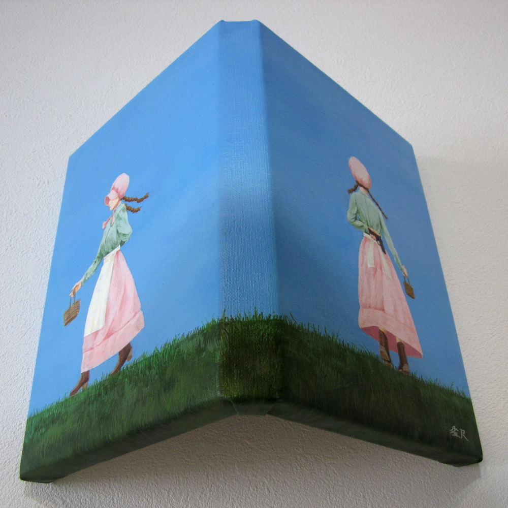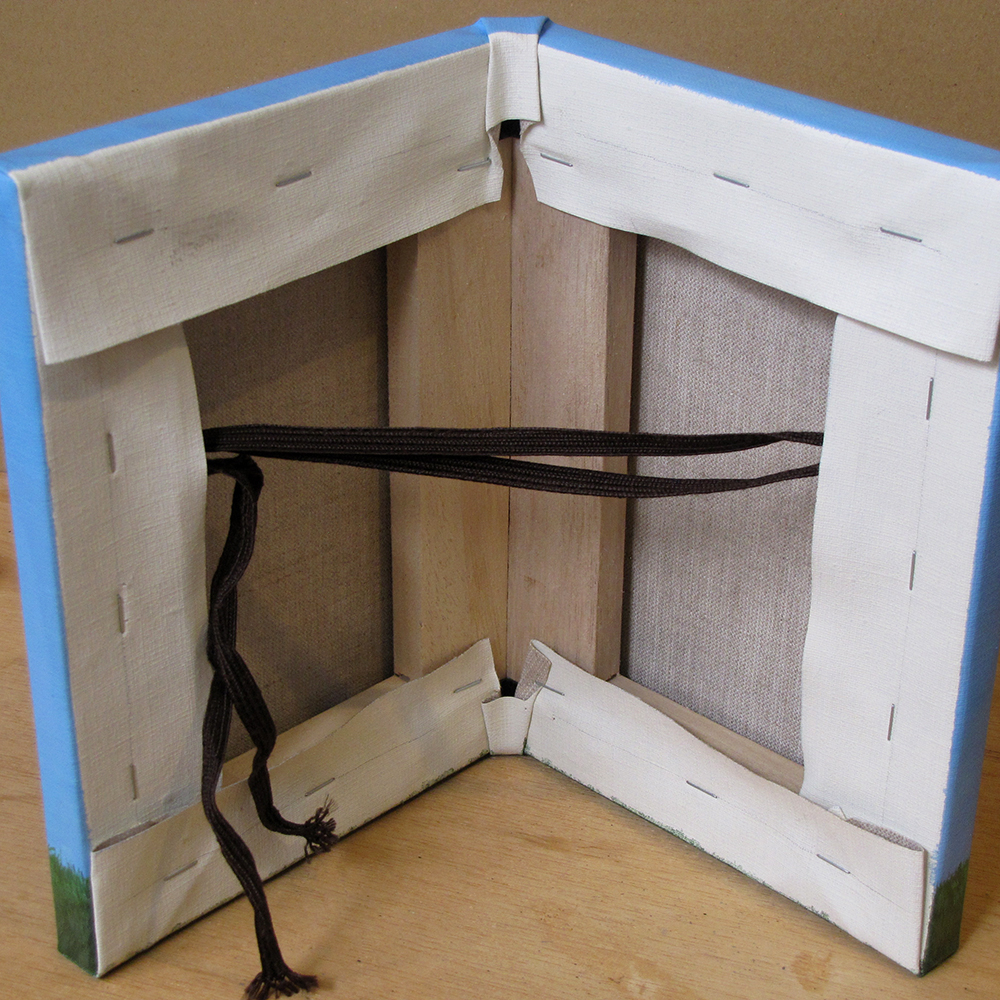 サムホールサイズの木枠二つを金具で結合しキャンバスを張って支持体にしています。吊り紐により壁面に展示出来ます。