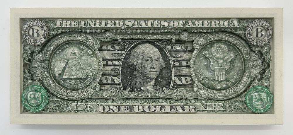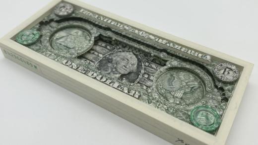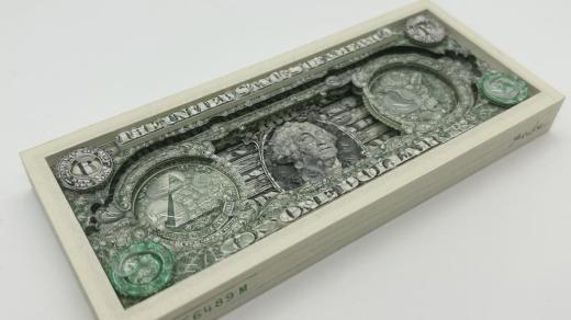 Shadow box style money collage / US banknote , resin, silicon, foam core board