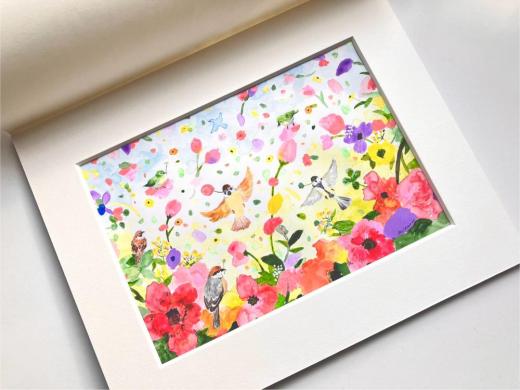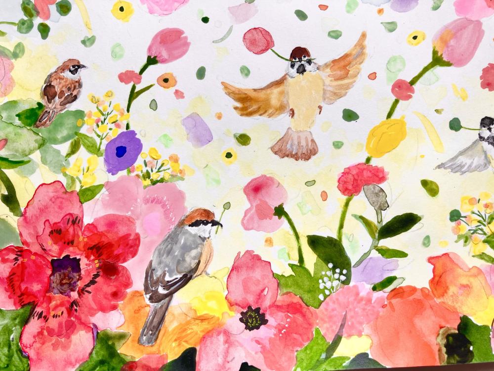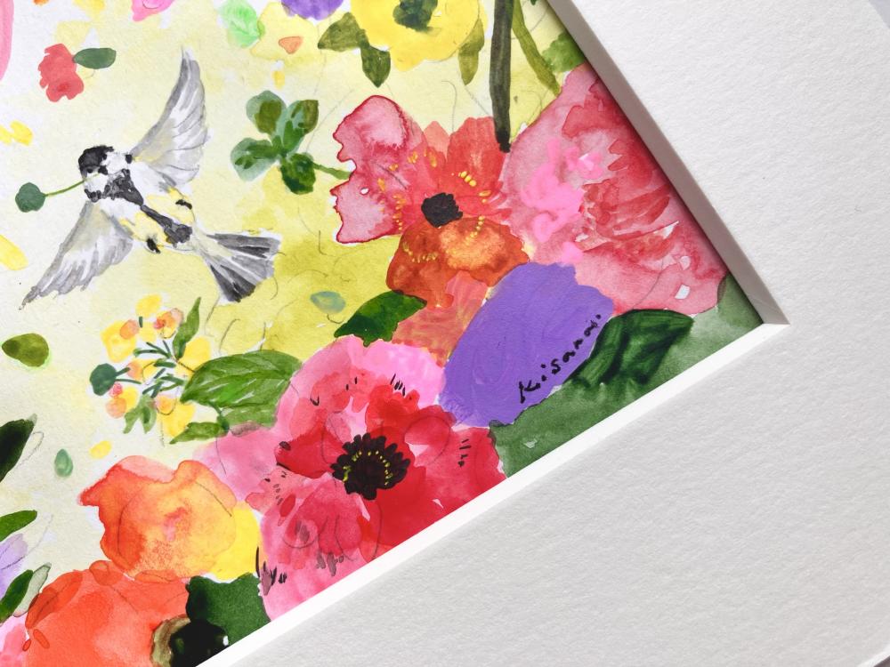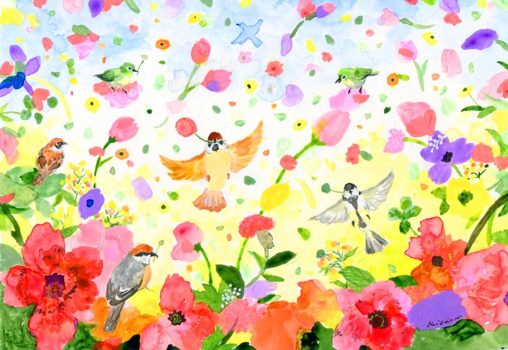 花や動植物たちのみずみずしい生命力が、紙やキャンバスの上に再び息を吹き返す、それが星きさら氏の絵の楽しさです。それらの合間に時おり、鳥や動物たちが騙し絵のように調和していることにも気づくでしょう。あえて輪郭をクリアにしない、味わい深い絵筆のストローク。色の群れが咲き誇るように構成されるスタイルは、彼女の心眼に写った”新しい景色”を私たちの印象深くへ吹き込むのに十分な、マジカルな迫力を備えています。