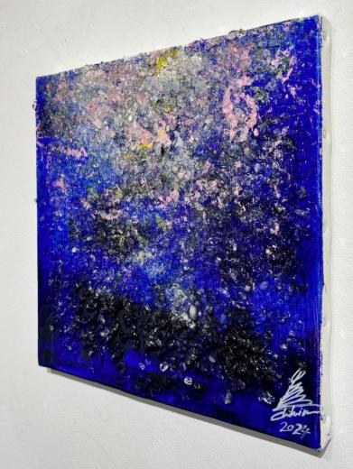 自然界の生命力を転送してくれるような、サトチヒロ氏の絵画世界。それを極めて独特なものにしているのは、絵具に加え「水晶」を画材として用いることで生まれるダイナミックな絵肌とその輝きです。