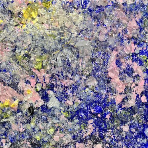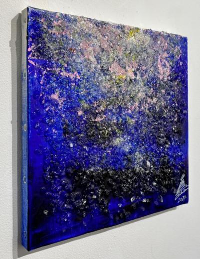 水晶は、気の浄化やカームダウンに役立つなど代表的なパワーストーンとされています。カウンセラーやデザイナーとして様々な素材・物質を研究する過程で彼は、この作用を絵画に活かす手法を開発してきました。通常、水晶を粉末化したものは日本画において透き通った白の表現に用いられますが、サト氏の絵では天然の水晶が細石(さざれ)状で使われ、絵の放つエネルギーをブーストし、より強く豊かにするのです。世界でも類例のない独特な絵画手法への評価は定着してきており、絵によって癒やされる、などという体験をナラティブに伝え合おうとする熱心なコレクター層が形成されています。