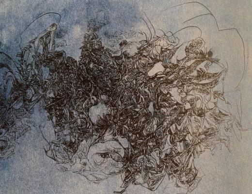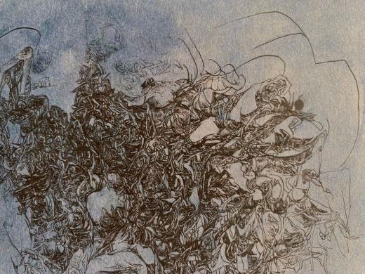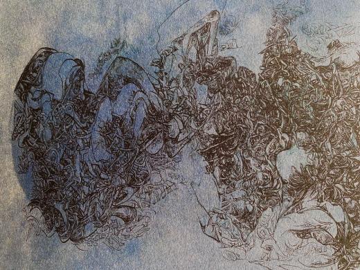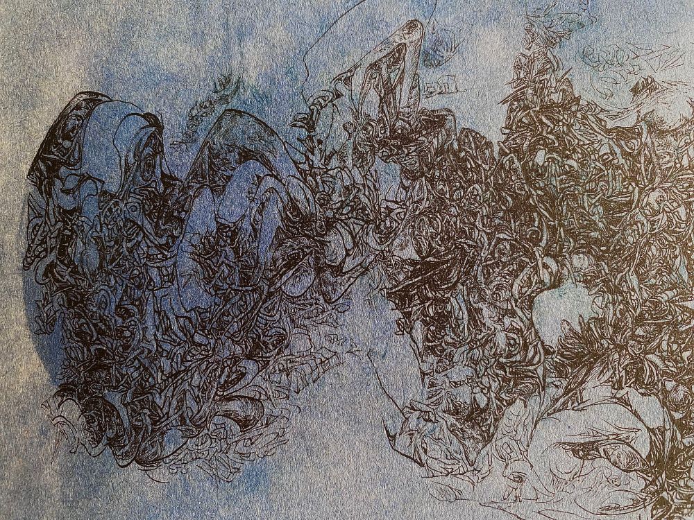 Each one of her lines, which are precise but sometimes boldly drawn, overlap numerous times and intersect, creating a wide range of tones and pulling us in to the deep world of the artwork.