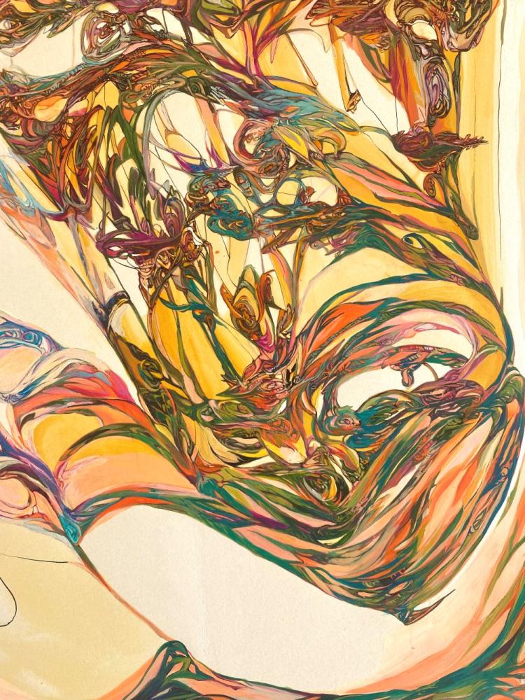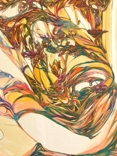 Each one of her lines, which are precise but sometimes boldly drawn, overlap numerous times and intersect, creating a wide range of tones and pulling us in to the deep world of the artwork.