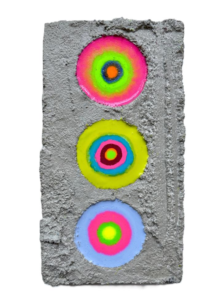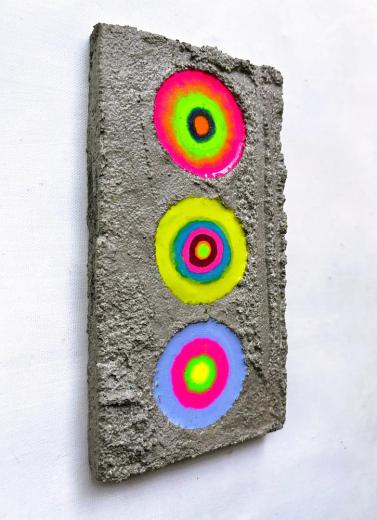 私の代表作である「Beautiful cell ? 美しき細胞 ?」シリーズ作です。 木製パネルにセメントを施し、リズミカルに開けた穴へ数色の着色樹脂を流し込むことで、偶然に溶け合う色の動きを「細胞の誕生」として表現しています。 無数の細胞が集まりひとつの生命体を形づくるように、人もまた一つの受精卵から生まれた“奇跡の存在”であることを思い起こさせ、「自分を愛することの大切さ」をそっと問いかける作品です。