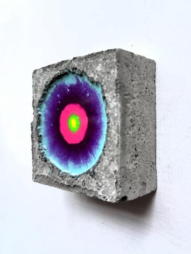 私の代表作である「Beautiful cell ? 美しき細胞 ?」シリーズ作です。 木製パネルにセメントを施し、リズミカルに開けた穴へ数色の着色樹脂を流し込むことで、偶然に溶け合う色の動きを「細胞の誕生」として表現しています。 無数の細胞が集まりひとつの生命体を形づくるように、人もまた一つの受精卵から生まれた“奇跡の存在”であることを思い起こさせ、「自分を愛することの大切さ」をそっと問いかける作品です。