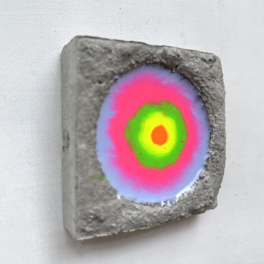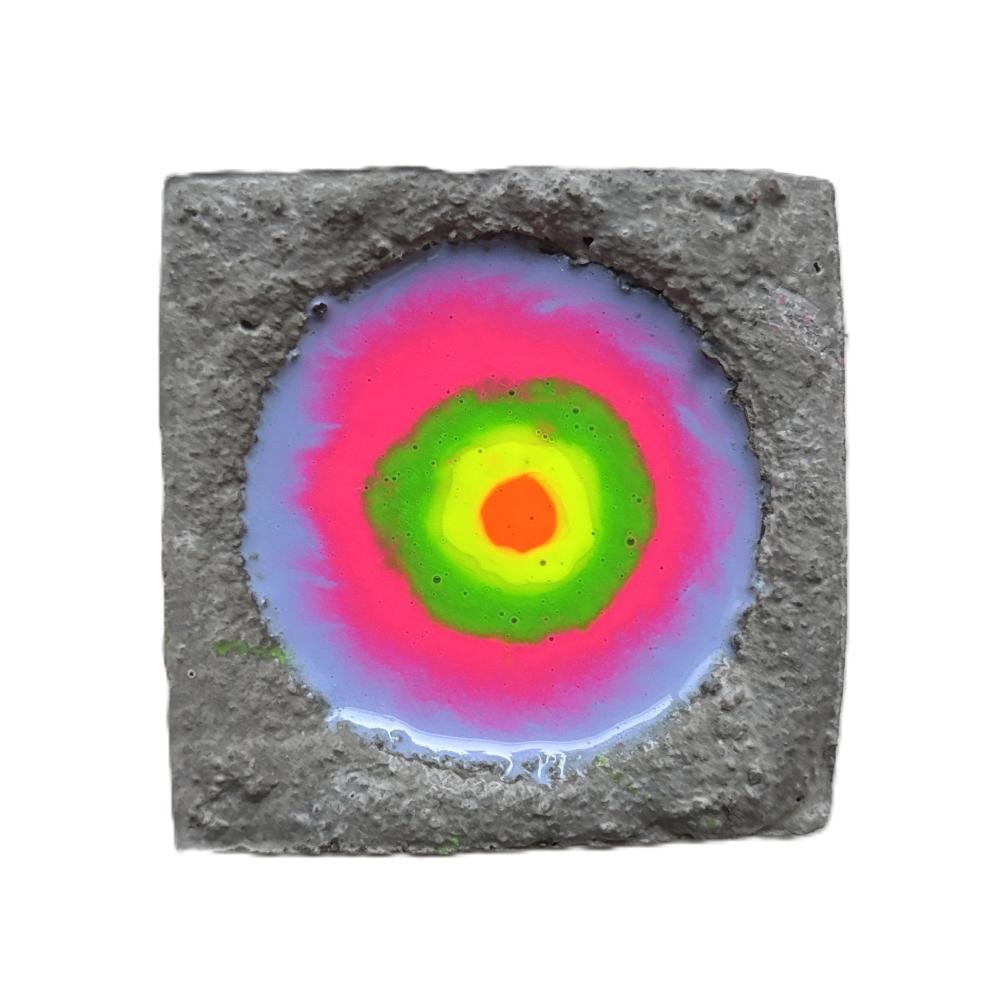 私の代表作である「Beautiful cell -美しき細胞 -」シリーズ作です。 木製パネルにセメントを施し、リズミカルに開けた穴へ数色の着色樹脂を流し込むことで、偶然に溶け合う色の動きを「細胞の誕生」として表現しています。 無数の細胞が集まりひとつの生命体を形づくるように、人もまた一つの受精卵から生まれた“奇跡の存在”であることを思い起こさせ、「自分を愛することの大切さ」をそっと問いかける作品です。