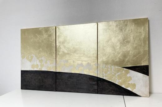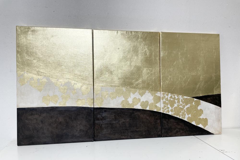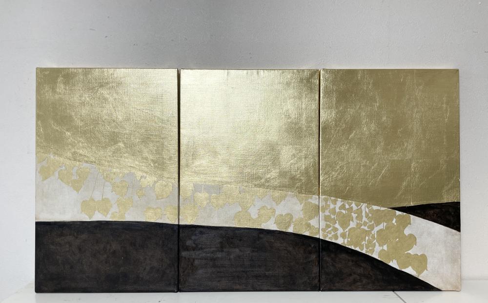 キャンバスに箔と油彩で蔦の細道を描きました。 3枚組です。 3枚の後ろは繋がっておりませんので、一枚ずつ飾ることも可能です。 (一枚の大きさは33x53x1.8cmです)