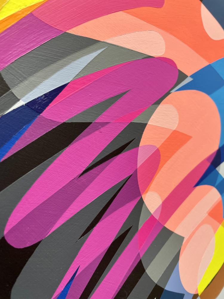 The vivid colors on the canvas emerge not only from the physical layering of marks, but also from the overlap of my own accumulated experiences?of time, culture, style, and environment.
