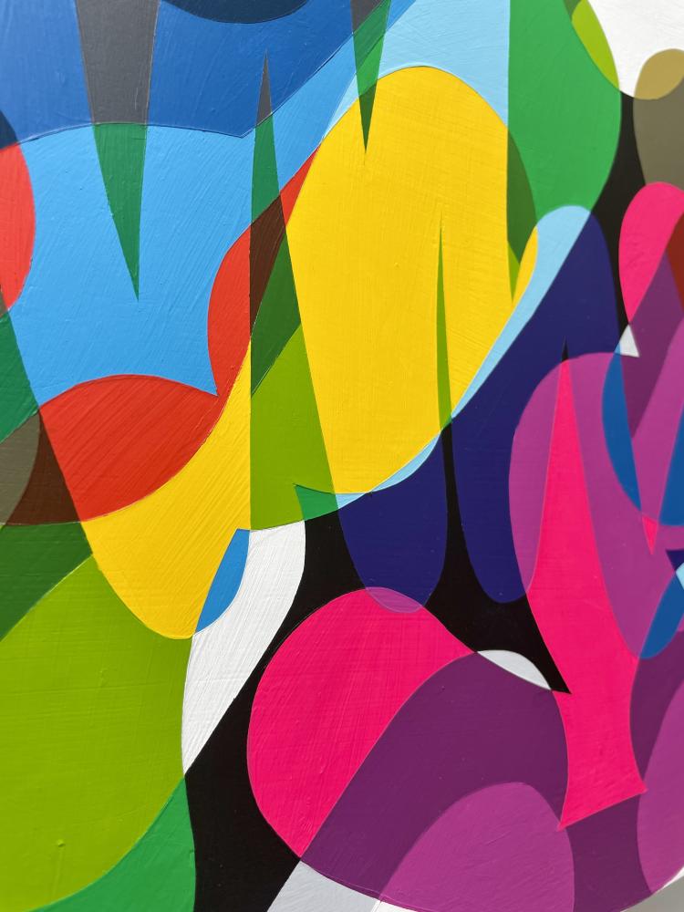 The vivid colors on the canvas emerge not only from the physical layering of marks, but also from the overlap of my own accumulated experiences?of time, culture, style, and environment.