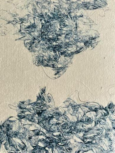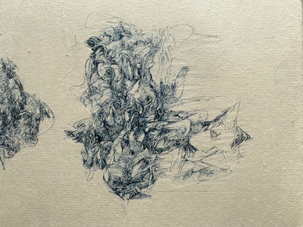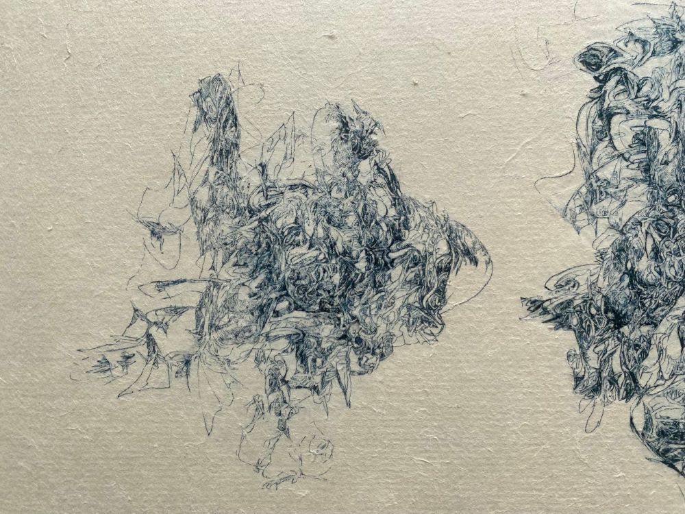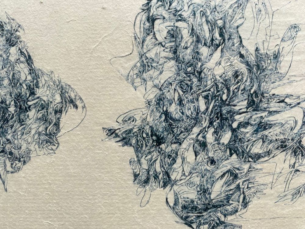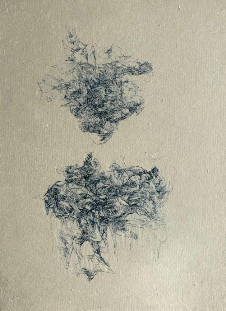 Each one of her lines, which are precise but sometimes boldly drawn, overlap numerous times and intersect, creating a wide range of tones and pulling us in to the deep world of the artwork.