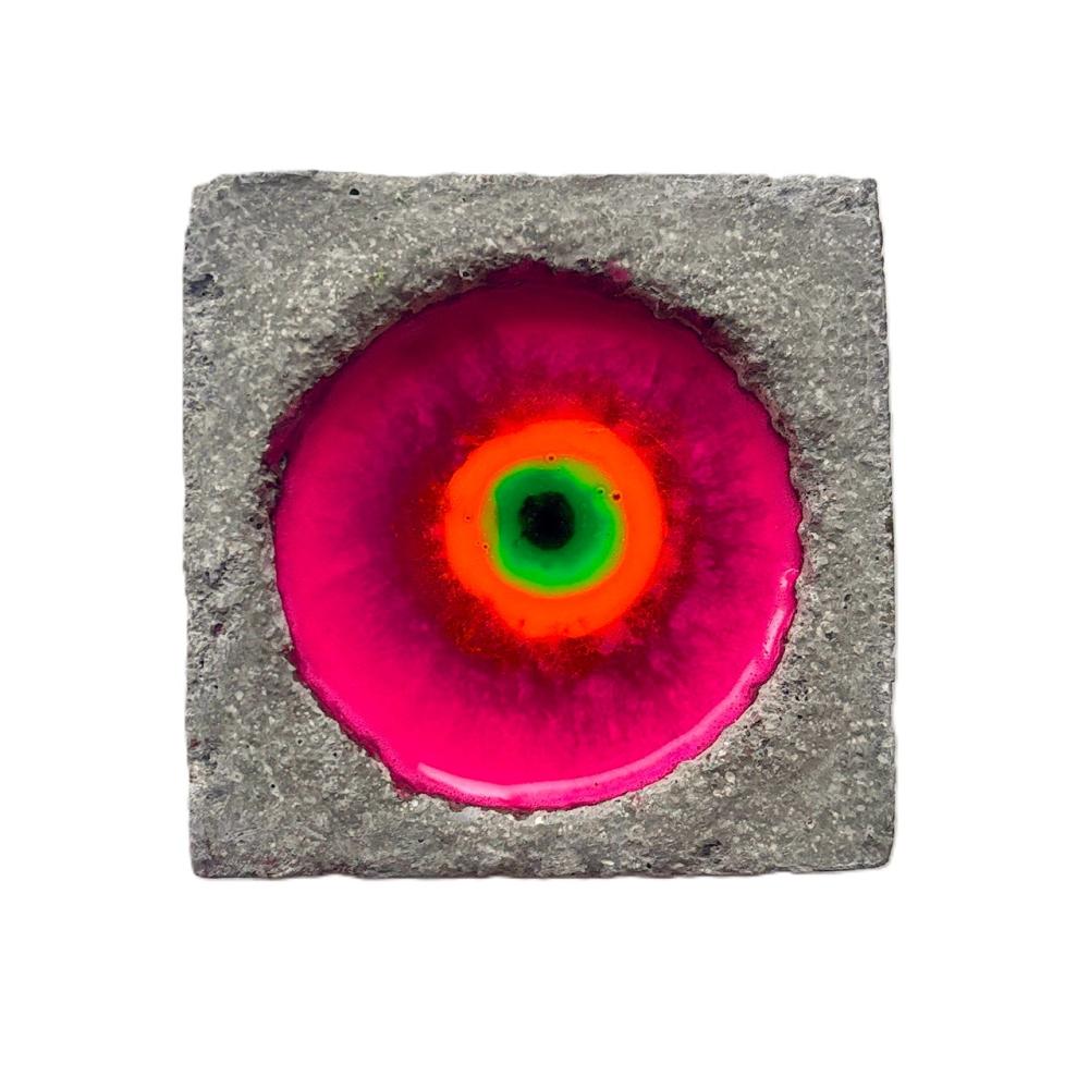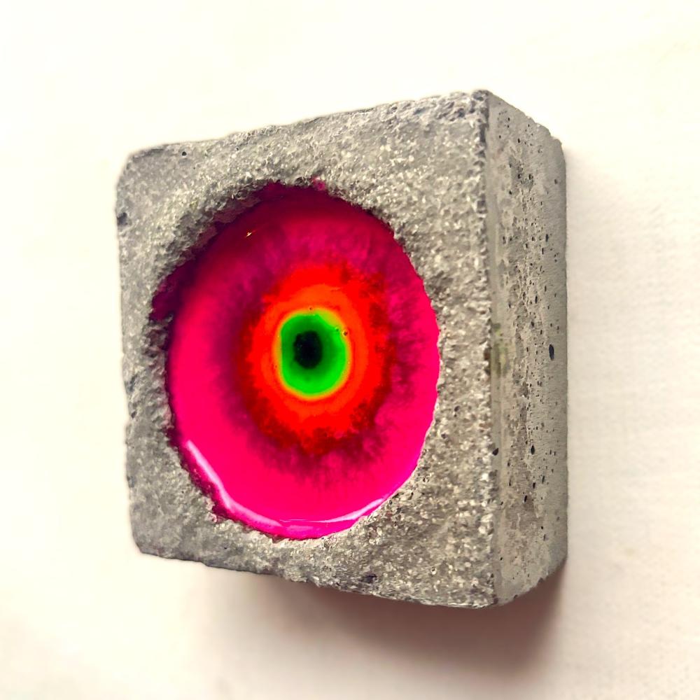 私の代表作である「Beautiful cell -美しき細胞 -」シリーズ作です。 木製パネルにセメントを施し、リズミカルに開けた穴へ数色の着色樹脂を流し込むことで、偶然に溶け合う色の動きを「細胞の誕生」として表現しています。 無数の細胞が集まりひとつの生命体を形づくるように、人もまた一つの受精卵から生まれた“奇跡の存在”であることを思い起こさせ、「自分を愛することの大切さ」をそっと問いかける作品です。