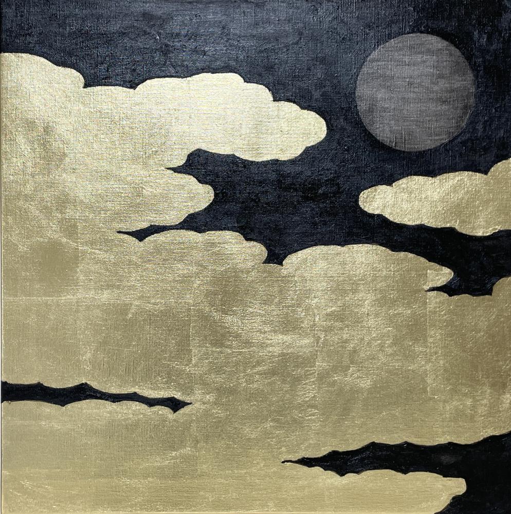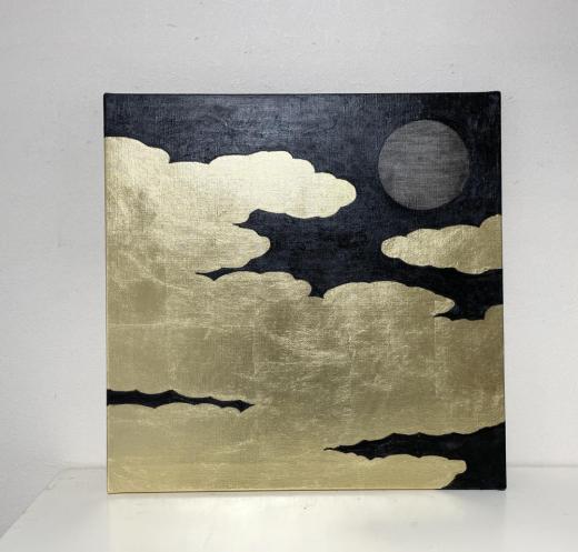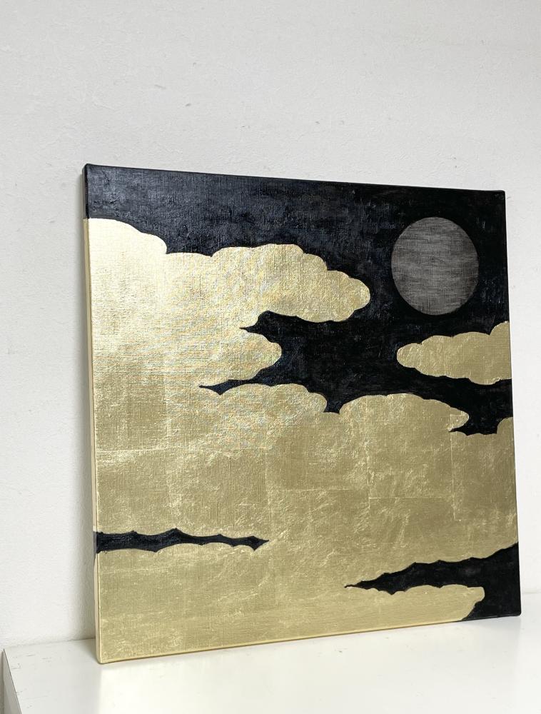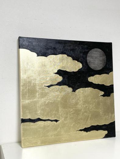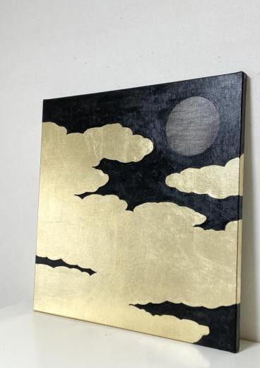 キャンバスに箔と油彩で雲間の月の絵を描きました。 上下逆でも飾ることができます。横も貼ってあるので、額装不要です。
