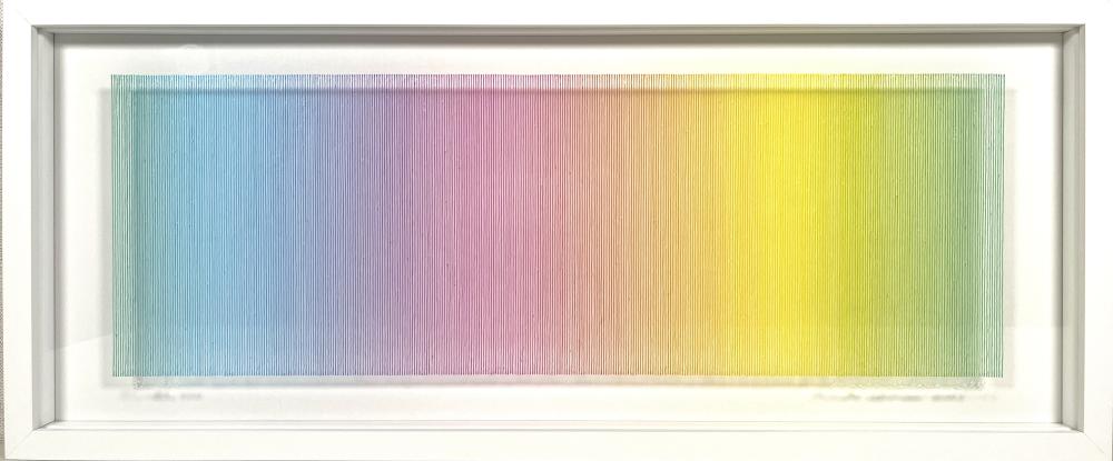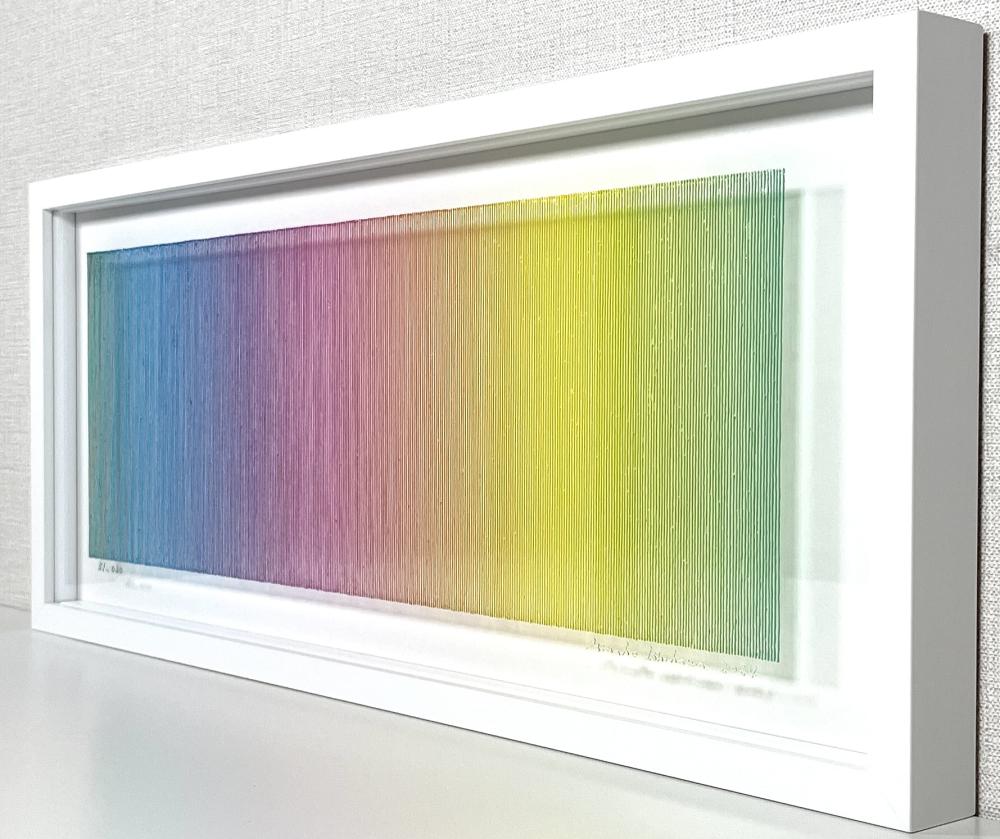 目の前にある空気、それはすべてを包み込み、あらゆるところに存在して、普段意識されることのない存在でもありますが、そんな空気の中の光をスペクトルに分解して取り出す、そんなイメージでこのWavelengthsシリーズの制作を始めました。 この作品は120色の色で構成されています。その120の色それぞれを尊重し、大切に思い、すべての色が全ての場所に来るように、120点の作品を作ろうと思います。