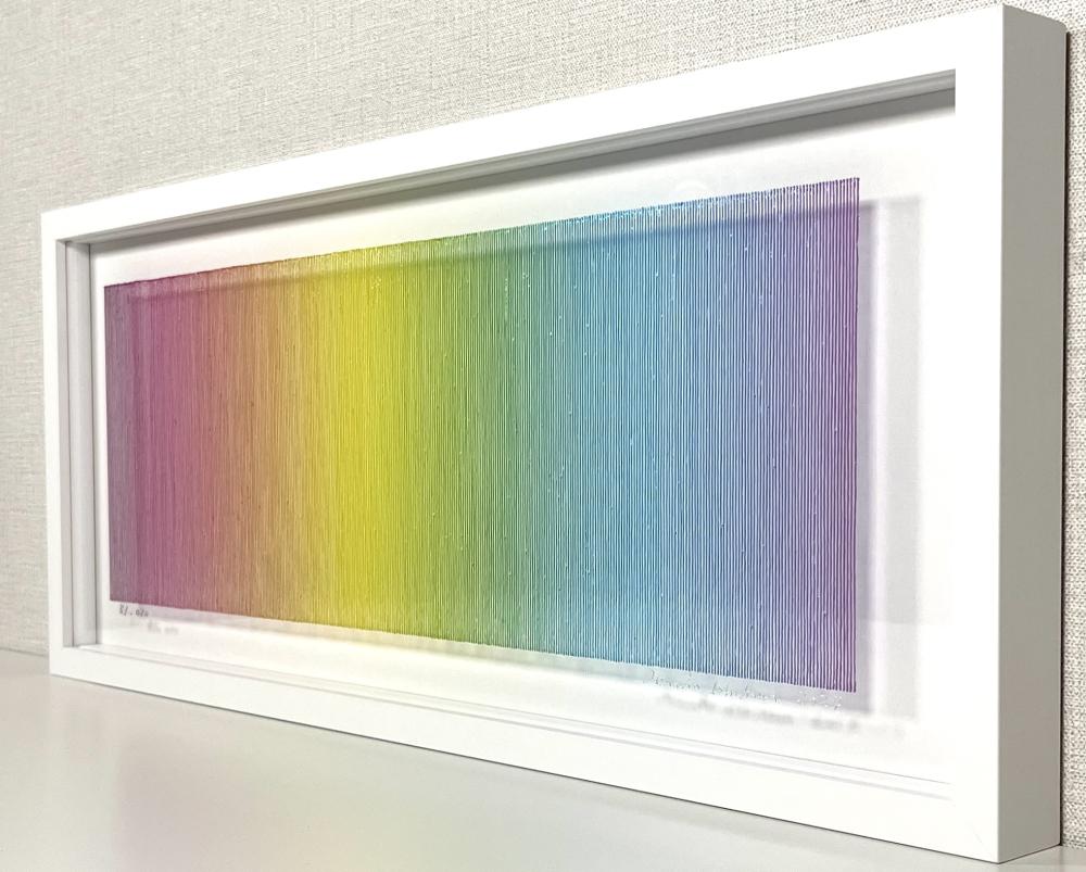目の前にある空気、それはすべてを包み込み、あらゆるところに存在して、普段意識されることのない存在でもありますが、そんな空気の中の光をスペクトルに分解して取り出す、そんなイメージでこのWavelengthsシリーズの制作を始めました。 この作品は120色の色で構成されています。その120の色それぞれを尊重し、大切に思い、すべての色が全ての場所に来るように、120点の作品を作ろうと思います。