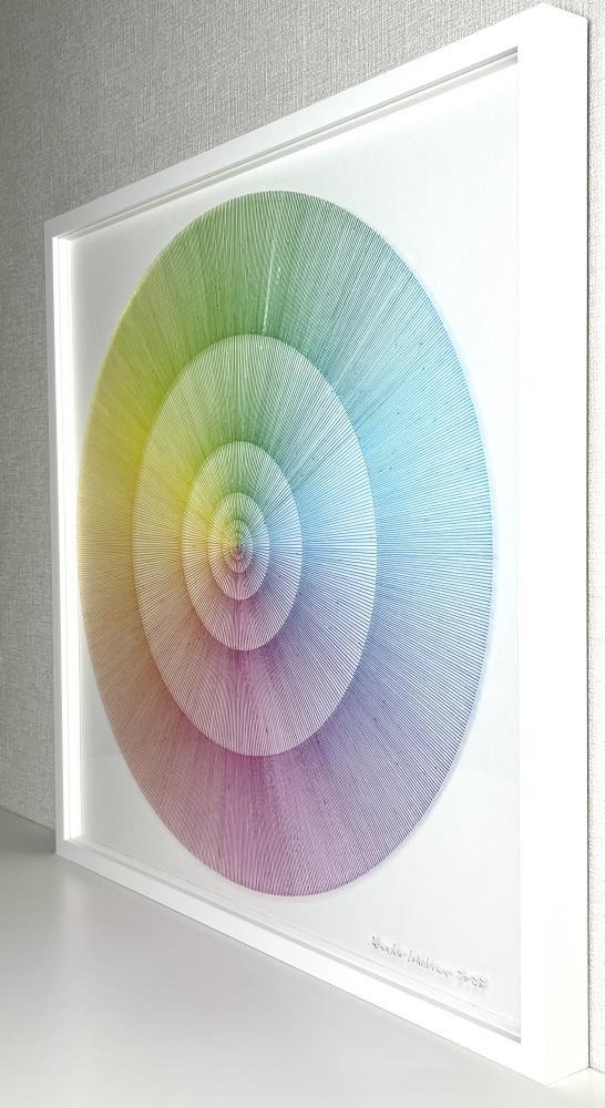 Artists who can draw beautiful gradations are hard to find in this world, right? The true beauty of Minako Ishikawa's work is that the lines are drawn with a single thin acrylic stroke, which is arranged among thousands while subtly changing the color scheme. It is not unusual for her to continue drawing a thin line with the same thickness in a straight line without it thickening left and right.It is surely what God makes. If you think that she paints her work with the colors of the rainbow on a transparent acrylic board, she will change it freely, like drawing with blue on a white canvas, and will attract viewers with her gradations. According to Ishikawa, this work is a work that extracts the "light" that fills the air. In addition, Minako Ishikawa's works feel crafty, beautiful and refreshing without being disturbing, giving us a feeling of openness that you will never get bored of even if you look at it many times. It seems that she has been able to earn high praise on international stage by holding exhibitions in Taiwan several times since two years ago. Despite being time consuming work, her work is highly popular because it is still being sold at a relatively affordable price, so it is advisable to purchase it now. She is one of the artists gathering attention who will grow even more in the future.