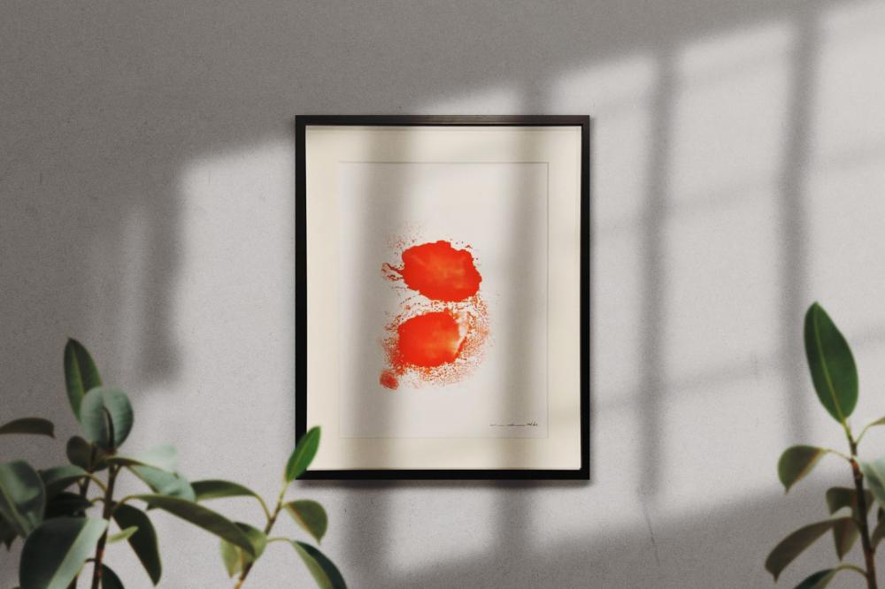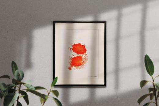 全体に軽微な波打ち、裏面にわずかな汚れの付着、以前額装時のテープ残り、額のアクリル板に線状のスレ傷が確認されているが、全体的には良好です。There is slight waviness throughout the piece, slight dirt on the back, tape residue from previous framing, and linear scratches on the acrylic panel of the frame, but overall it is in good condition.