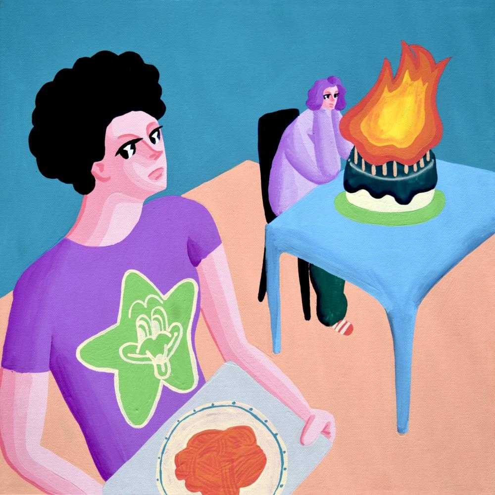 Born in 2001 in Hyogo, Japan. Currently based in Tokyo. With a playful, offbeat perspective on the world, she depicts slightly skewed realities through a humorous and deadpan touch. Influenced by the Showa-era manga once owned by her mother and aunt, her works explore scenes where human foolishness and coldness coexist, aiming to subtly jolt the viewer’s mind. Using mainly acrylic gouache and markers, she creates freely with vivid colors across various materials such as canvas, illustration board, and fabric. In recent years, she has expanded her practice through participation in art fairs such as Art Fair Beppu and by creating wall art for the Pentel × Mural Rookies Project. Guided by a spirit of playful freedom beyond rules or conventions, she continues to pursue her artistic expression with energy and curiosity.
