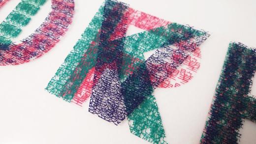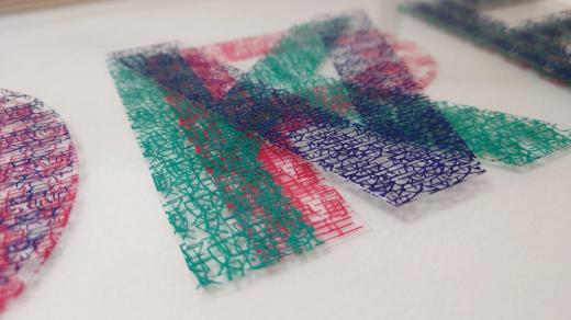 シルクスクリーンで手刷りしたアクリル板を重ねる