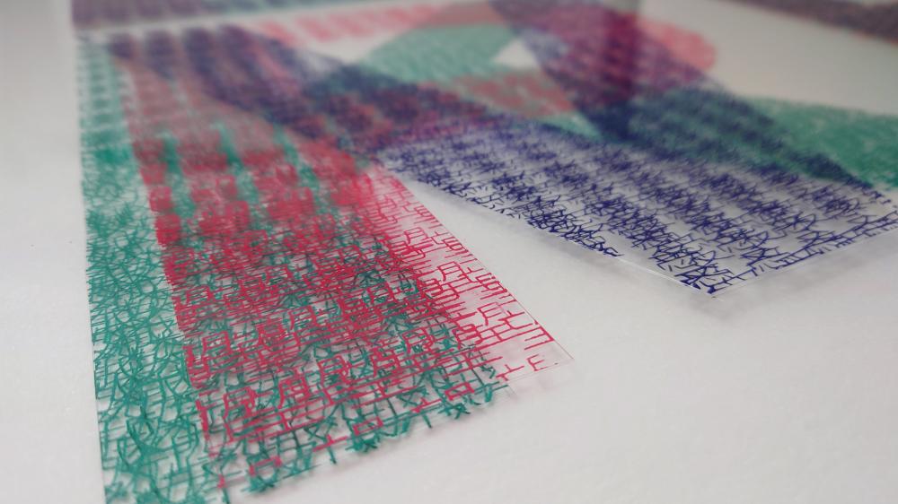 漢字という最小単位の記号を集合させ、新たな意味を持つ言葉を構築するシリーズです。一枚ずつ手作業でアクリル板にプリントを施すことで、文字の密集度や色味に意図的な揺らぎを与えています。