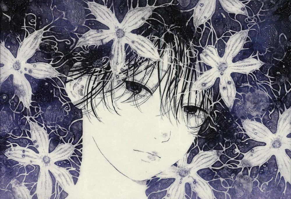 本作は、近作からの自薦の一点です。カラスウリの花に揺らぐ記憶をイメージして制作したもの。緻密に描き込まれた描画と、刷り色の豊かな階調が耽美的な世界観を醸し出しています。グループ展「ACT小品展 2025」(2025年、The Artcomplex Center of Tokyo)にて展示され好評を博しました。