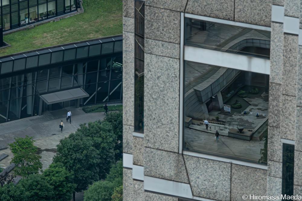建造物やそのガラス面に映り込む風景の中に、街や人々の息遣いを捉える「City Portrait」シリーズ。 本作は新宿・都庁から見下ろした風景。画面左を歩く人物と画面右を歩く人物(窓に映り込んだ像)は一見すると対の関係のように見えるが、実際には両者の間に関係はなく、ただ図像的にシンメトリーであるように位置しているのみである。 視覚優位の日常が錯覚を引き起こし、切り取られた一瞬の光景が見るものに揺らぎを与えている。