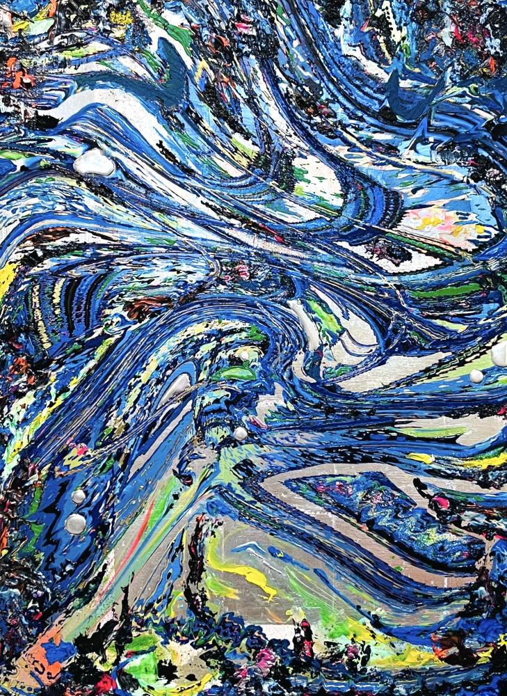 自身の実体験や思考・感情に紐付く写真・文字(フォント)・イラストレーション・ドローイング等をベースに加工と編集を繰り返し、具象的な存在を抽象化し銀箔などの上にUVインクジェットという印刷技術を用い印刷、さまざまなマテリアルを用い、ペイントを加えるなどして自分の手で上書きをする。