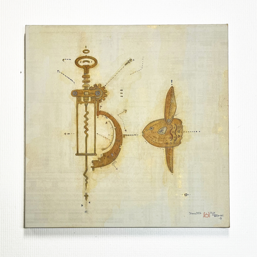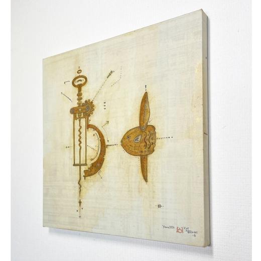 デジタル画像、アクリル、金泥、顔彩、水彩、色鉛筆、顔料インクの繰り返し、塗り重ねによる異なる質感のテクスチャの重なり合う効果(交差)を狙いました。