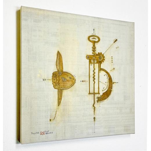 デジタル画像、アクリル、金泥、顔彩、水彩、色鉛筆、顔料インクの繰り返し、塗り重ねによる異なる質感のテクスチャの重なり合う効果(交差)を狙いました。