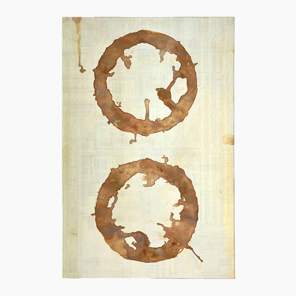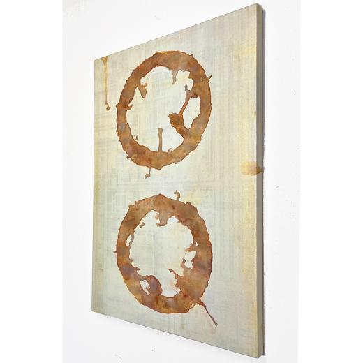 デジタル画像を顔料インクで出力した下地の上に、水筆で○を描き、数種類の水彩絵具,顔料、樹脂絵の具を流し込み、分離と混濁を繰り返す。