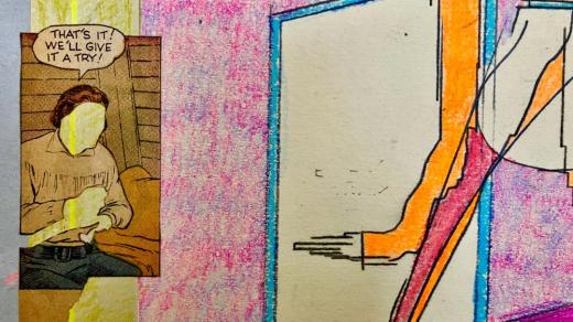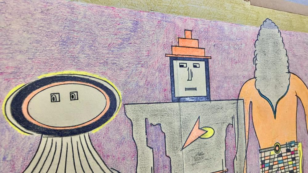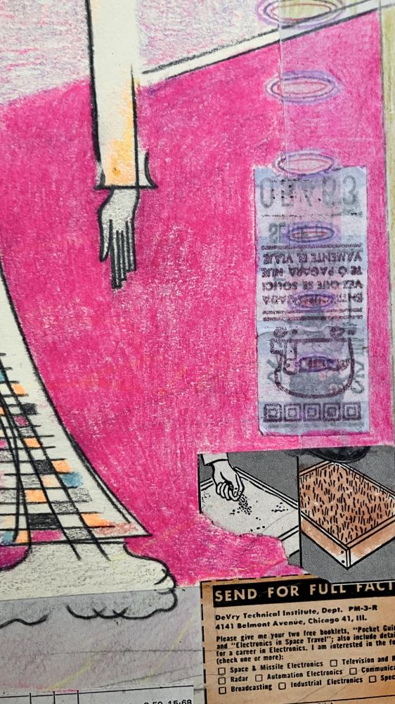 ドローイングとコラージュを組み合わせた、手描き看板のようでもあり、手書きポスターのようでもある、プリミティヴで工作感のある自由な雰囲気の作品。