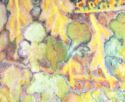 生物の幼生や幼体、植物の新芽や花などを描いている。成体になる前の柔らく曖昧なその段階は「これから」どのような形になるのかを想像させる存在でもある。また、絵を描く過程で発生する油絵具の滲みや掠れが、何かに見えそうと想像することも画面の「これから」を意識する行為である。何になるかわからない存在、あやふやな輪郭、絵具の変化、それらが絵画の中で浮遊し漂いながら、少しずつ形が浮かび上がってくる。そしてそれらが組み合わさり、ここではないどこか遠くの向こう側の景色になったとき、「これから」を想像させる絵画になるのではないかと思っている。