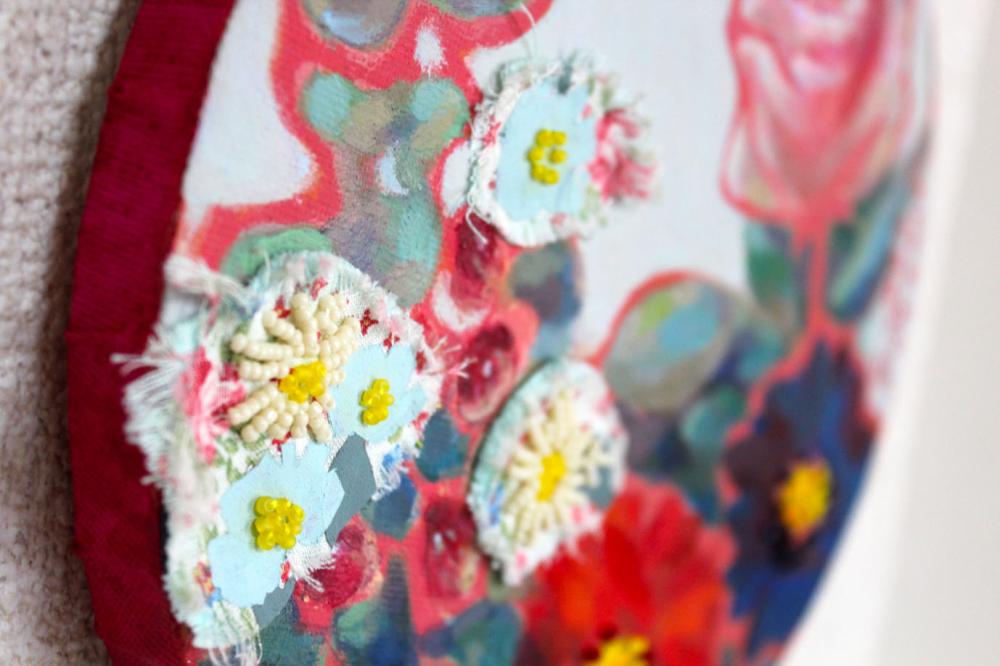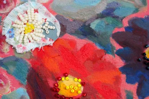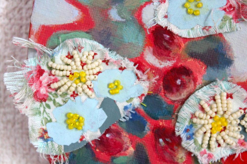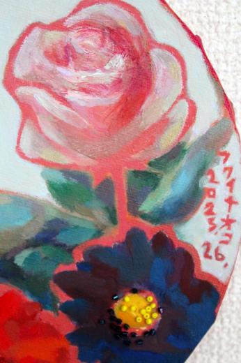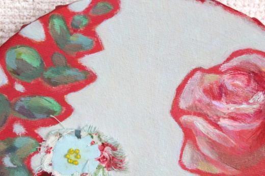 花がある部屋はどこかしら心がウキウキする気がする。 絵がある部屋は心が落ち着き、上質な日々が送れそうな気がする。 絵や花を飾る事で、日常が少しキラキラワクワクするような気が私はします。 そんな気がしませんか? 昔の小作品を解体して、新しくしく描いたこの作品に縫い付けました。