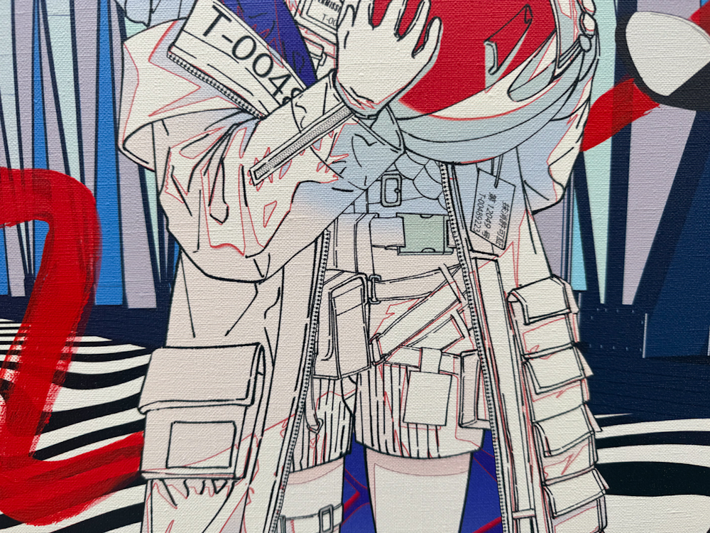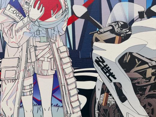 キャンバスに、デジタル描画をしたイメージをUV印刷を用いて出力したものの上から油彩で加筆をしたものになります。