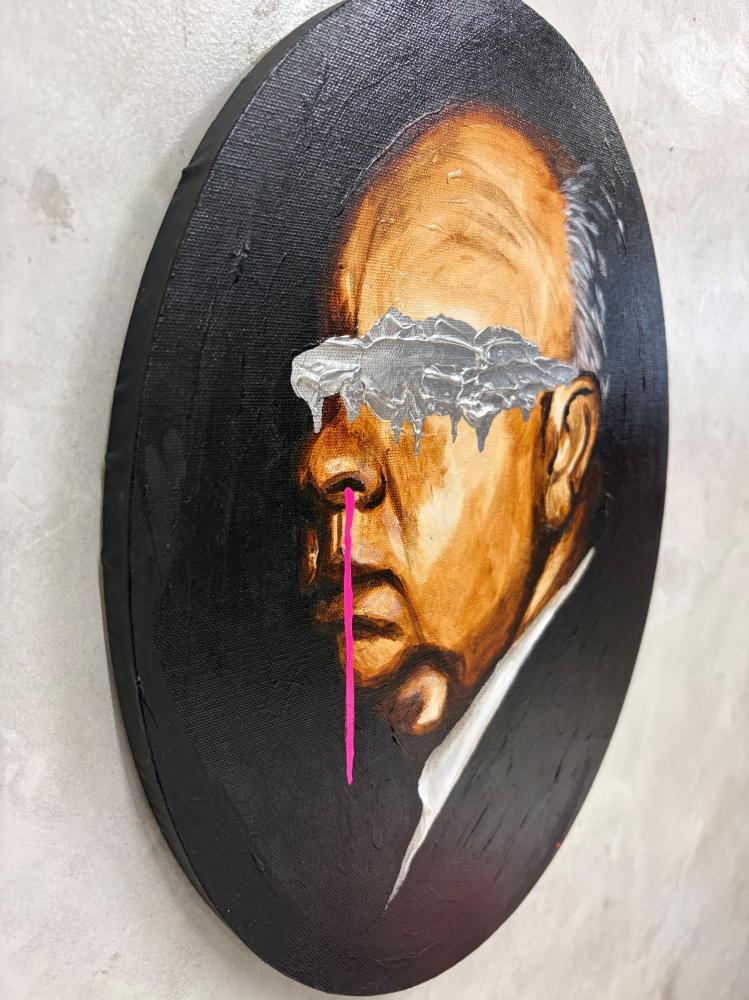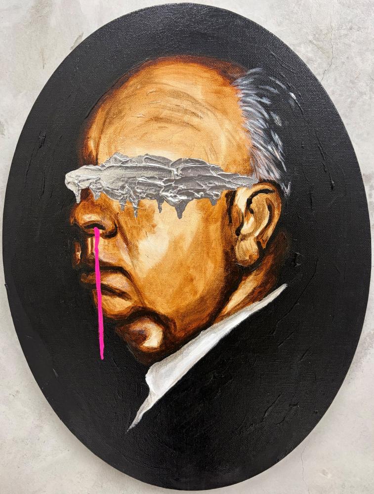 本作は、近作からの自薦の1作です。カルチュラルアイコンが想起させる時代へのオマージュが光る作品。楕円の画面に配置した肖像画のクリシェもユーモラスです。
