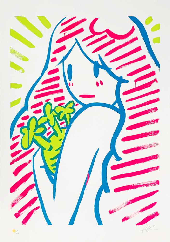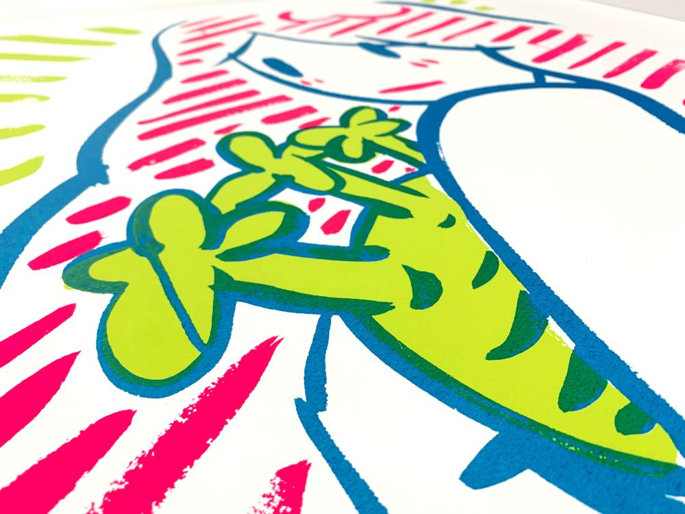 鮮やかな蛍光色のピンクやイエロー、ブルーによって描かれた女性像が、画面全体に軽やかなリズムを生み出している。シルクスクリーン特有のフラットで鮮明な色面が、天野タケルのアイコニックな人物像をよりグラフィカルに際立たせている。