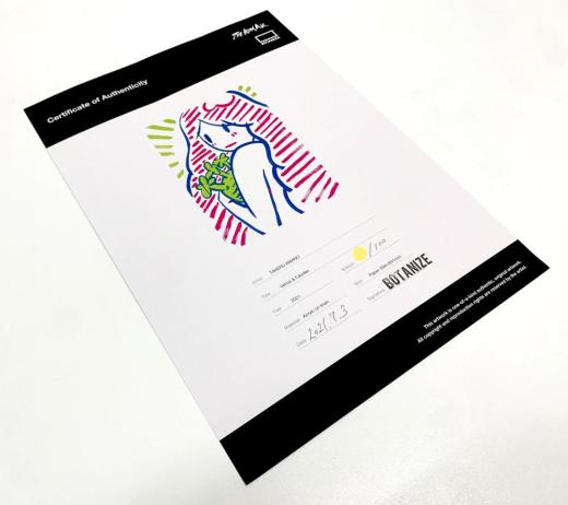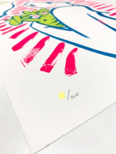 シルクスクリーンによる、直筆サイン入りのエディション作品(ED.100)。