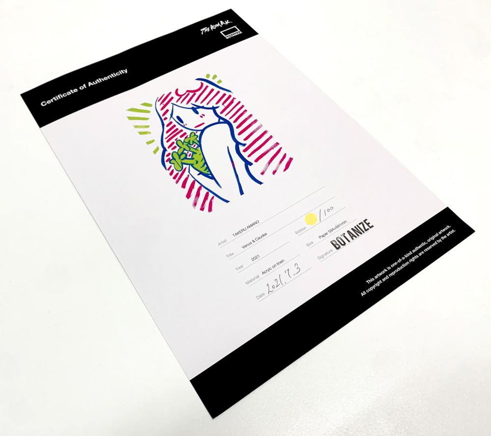 西洋美術の古典的な美の象徴と、日本のポップカルチャーの感覚が融合した天野タケルの世界観が端的に表れた作品であり、鮮やかな色彩とアイコニックなキャラクター性が魅力の一作である。
