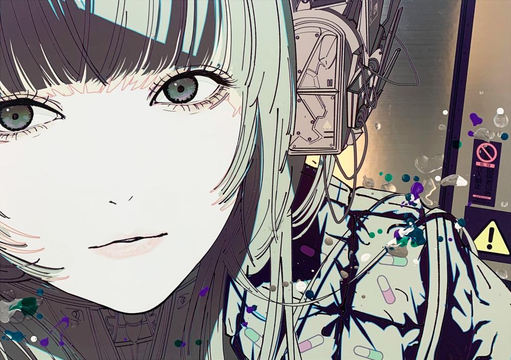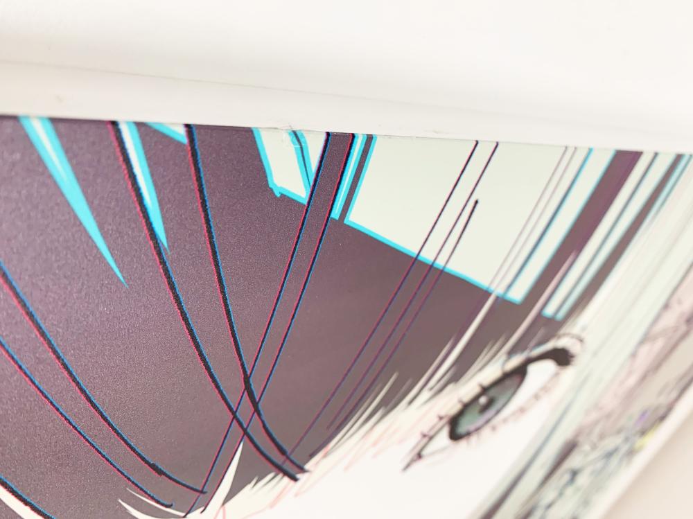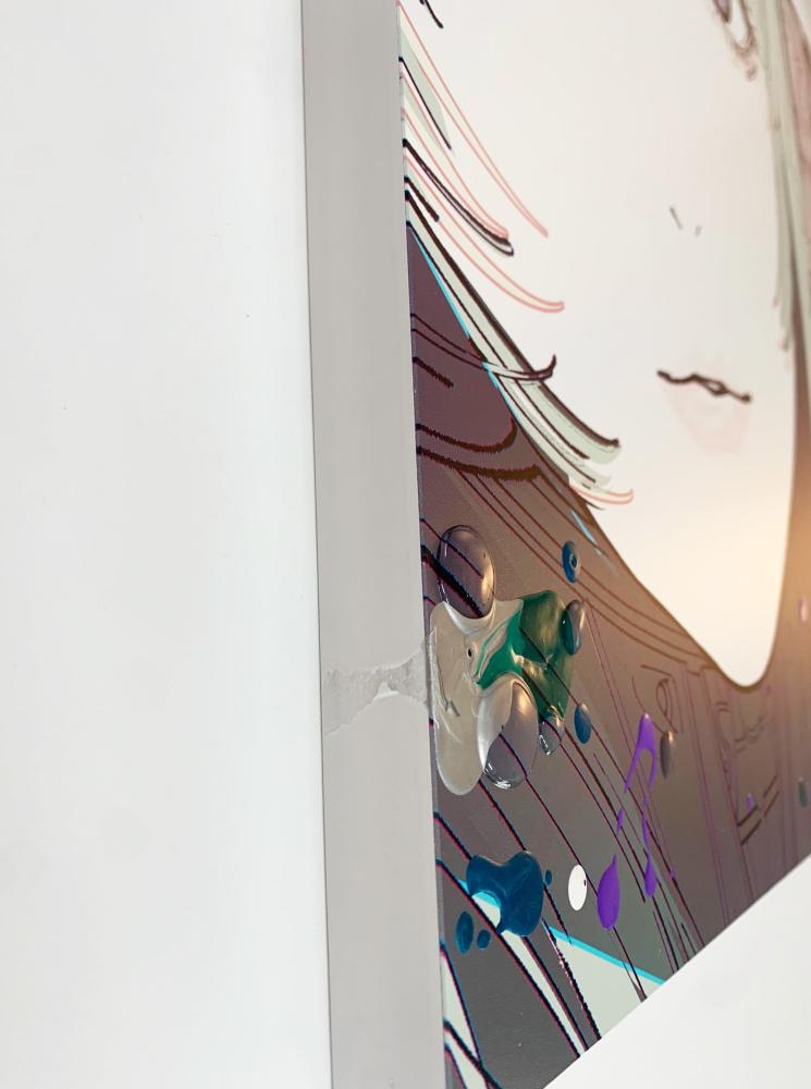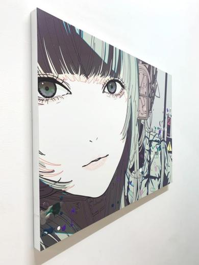 画面の所々が無機質なアルミ板に似た質感になるような印刷技術を用い、さらにその上に描画材で加筆をして制作しています。