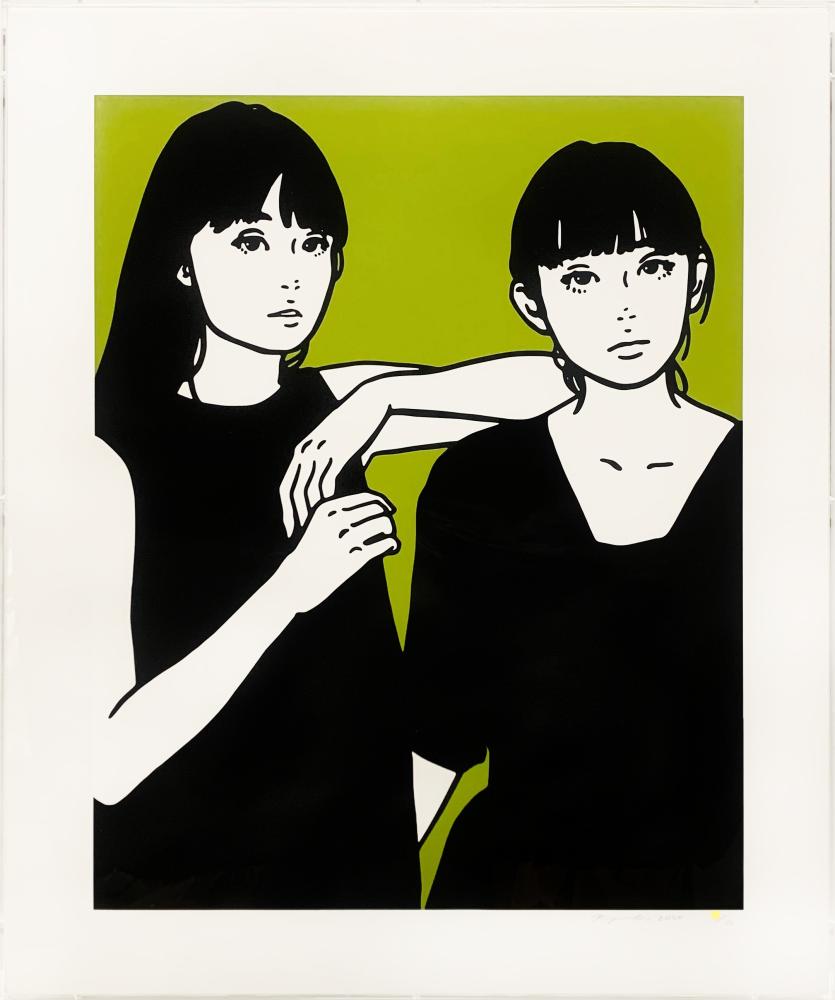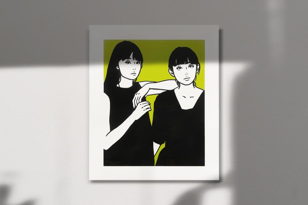 KYNE is known for his distinctive portraits of women, defined by minimal linework and flat color compositions. In this piece, two women dressed in black are depicted side by side, with one figure gently placing her arm over the other's shoulder, creating a quiet sense of connection within the composition.