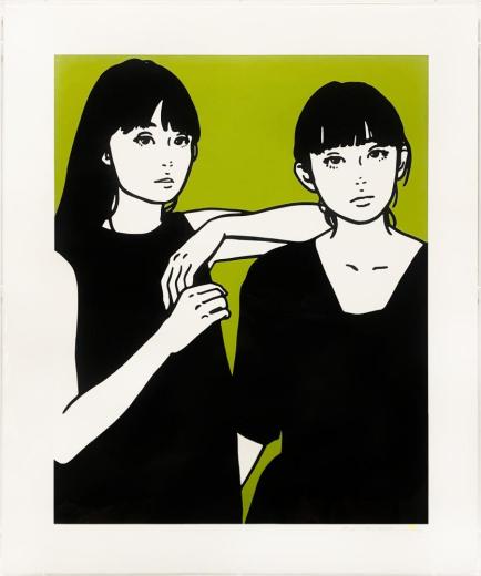 The vivid lime-green background contrasts strongly with the monochrome figures, emphasizing the graphic clarity that characterizes KYNE’s work. Smooth outlines and a simplified composition draw attention to the expressions and gazes of the figures, producing a refined pop-art aesthetic within a restrained visual language.
