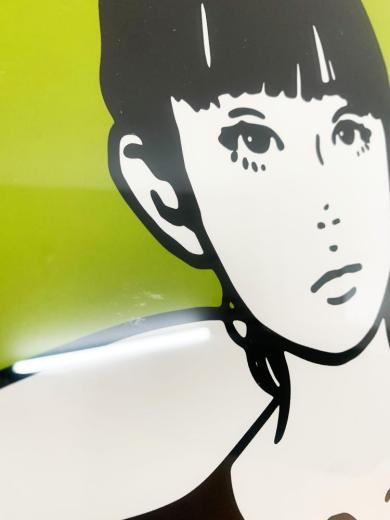 鮮やかなライムグリーンの背景とモノクロームの人物像の強いコントラストは、KYNEの作品に特徴的なグラフィカルな美しさを際立たせている。滑らかな輪郭線と簡潔な構図によって、人物の表情や視線が強く印象に残り、シンプルな画面構成の中に洗練されたポップアート的感覚が表現されている。