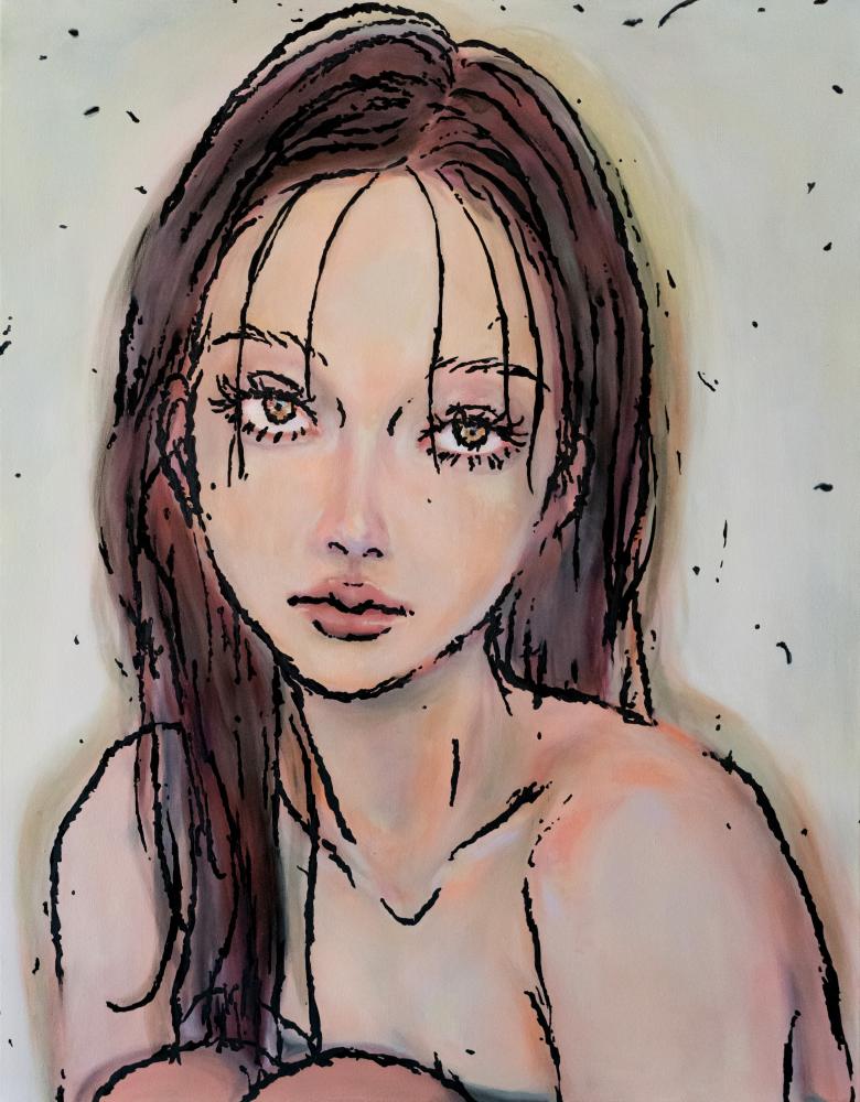 実写のような生々しい質感の上に、これまで描き続けてきた「線」を重ねる試みだ。
