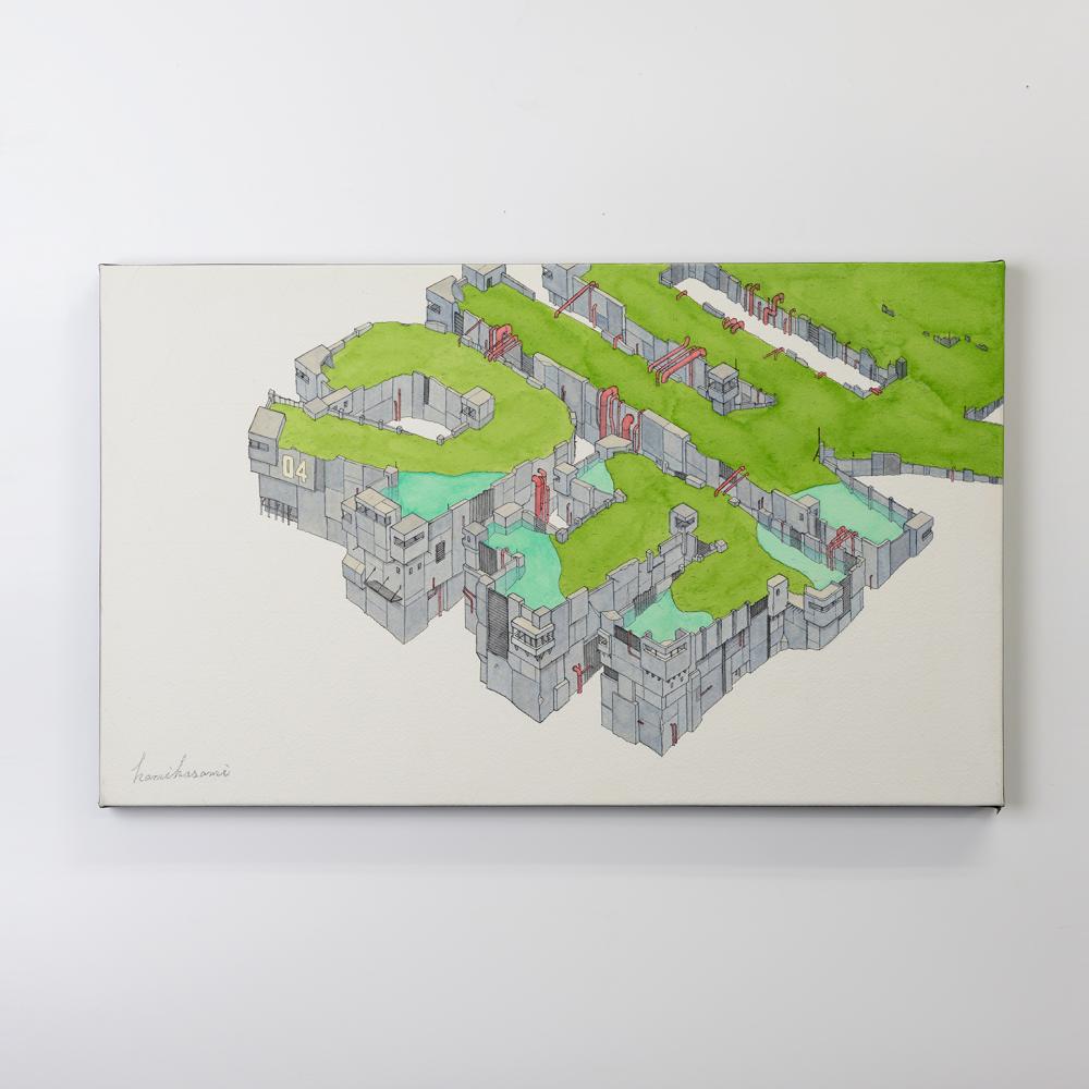 文字のプロポーションを起点に、等角投影図で建築的に描き進めた。