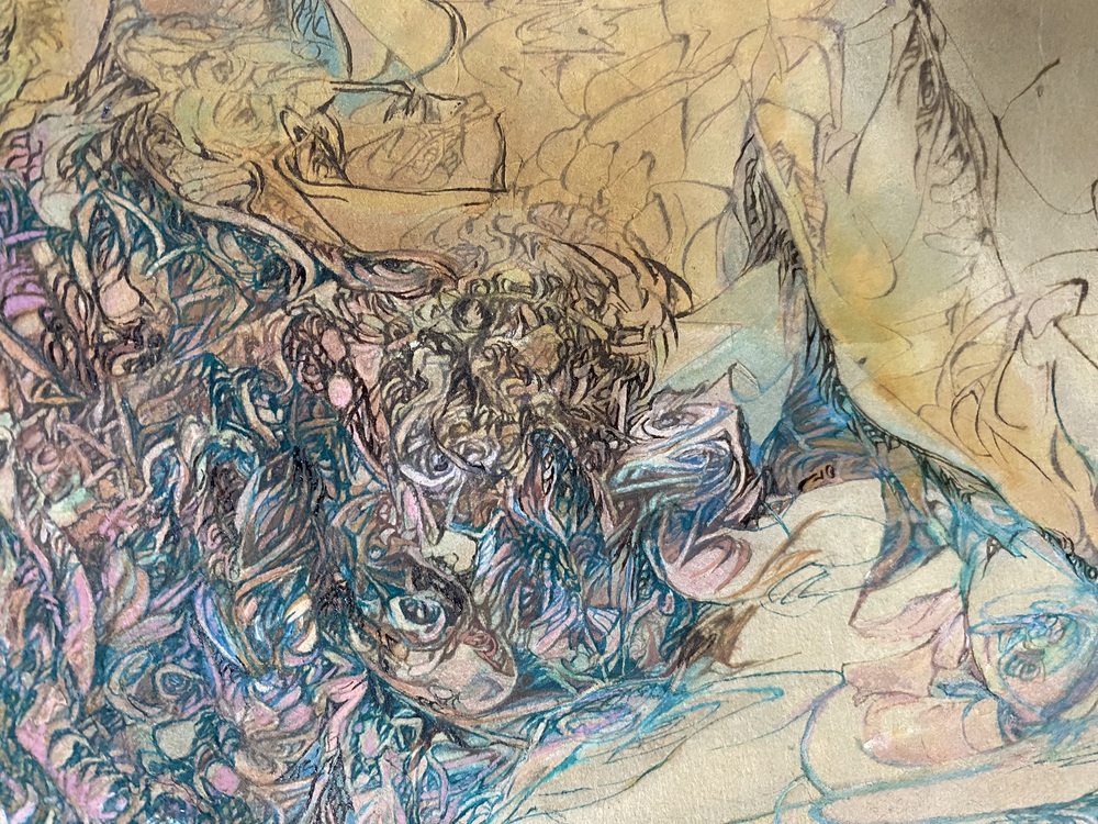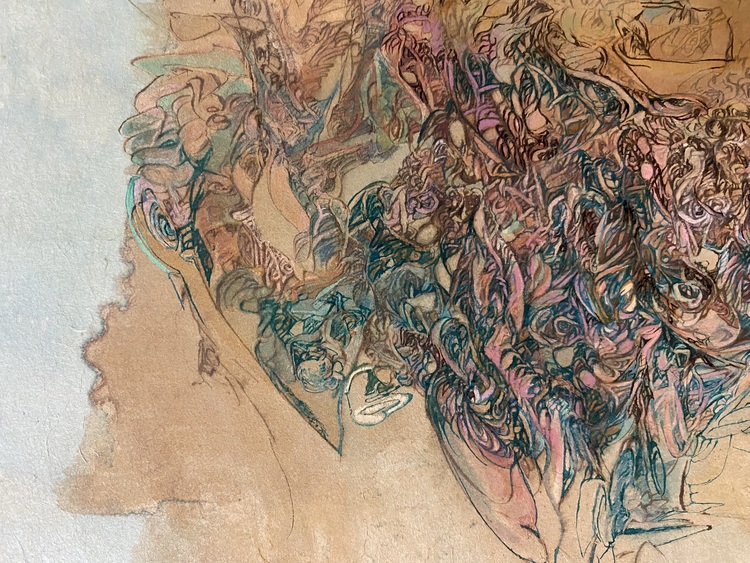Each one of her lines, which are precise but sometimes boldly drawn, overlap numerous times and intersect, creating a wide range of tones and pulling us in to the deep world of the artwork.